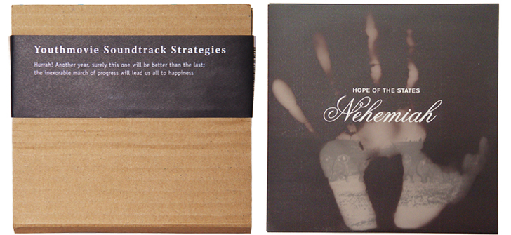 Left: Youthmovie Soundtrack Strategies' Hurrah! Another Year, Surely This One Will Be Better Than the Last; The Inexorable March of Progress Will Lead Us All to Happiness, 2004; album artwork?Right: Hope of the States' Nehemiah, 2004; single artwork (heat activated)